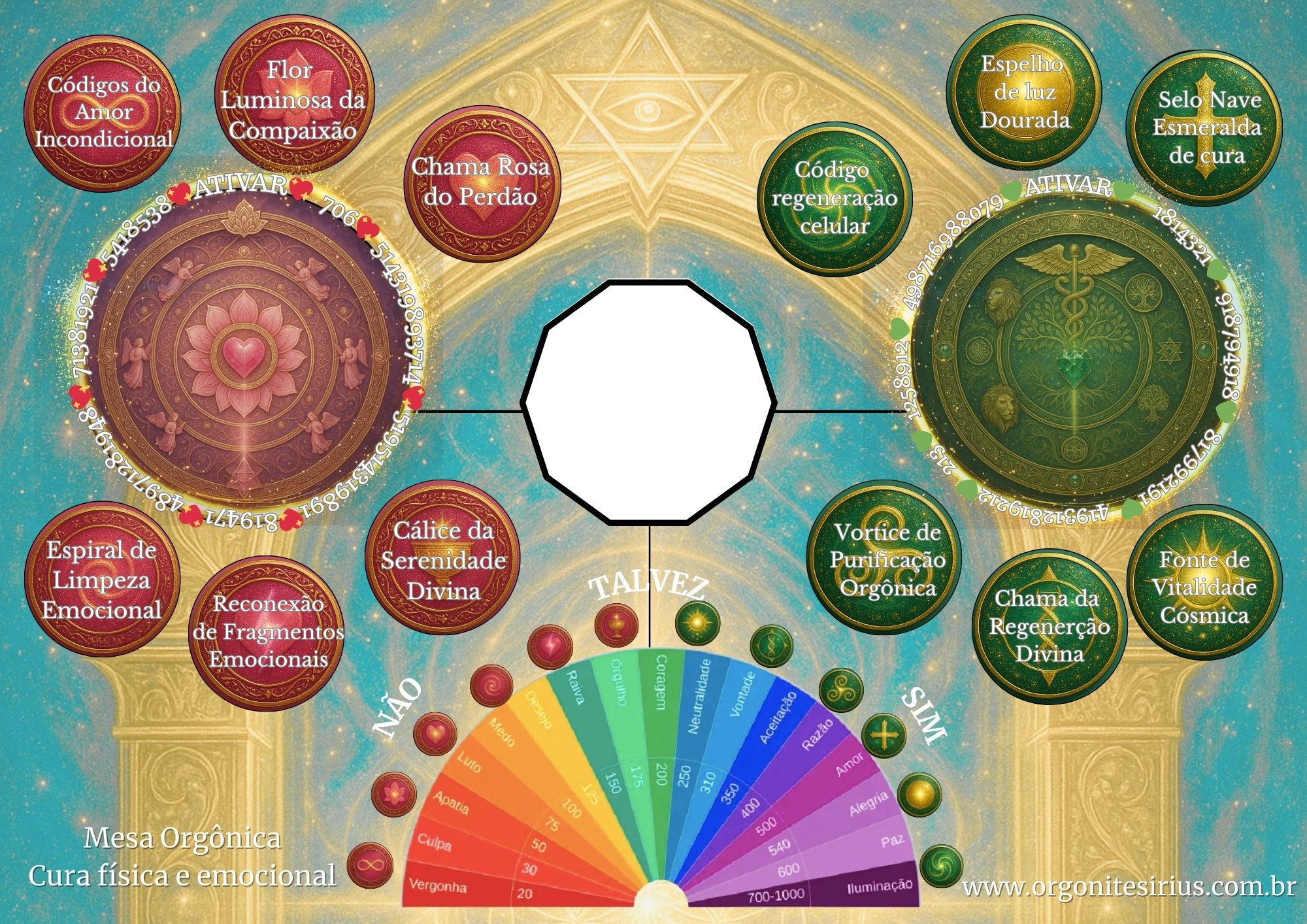 Esta mesa possui 12 ferramentas vibracionais específicas, cada uma representada por um orgonite emissor.